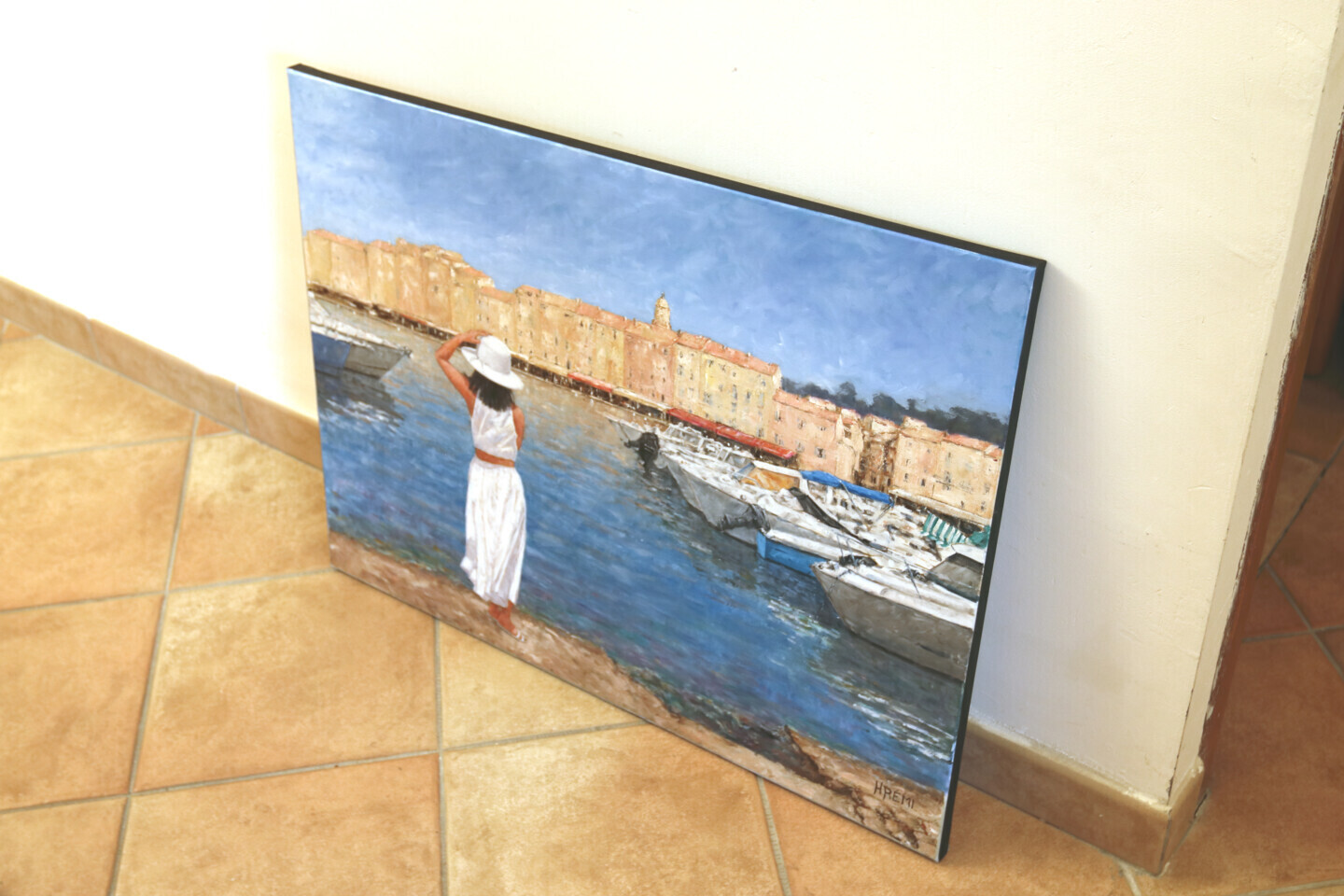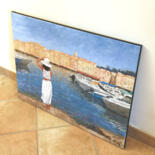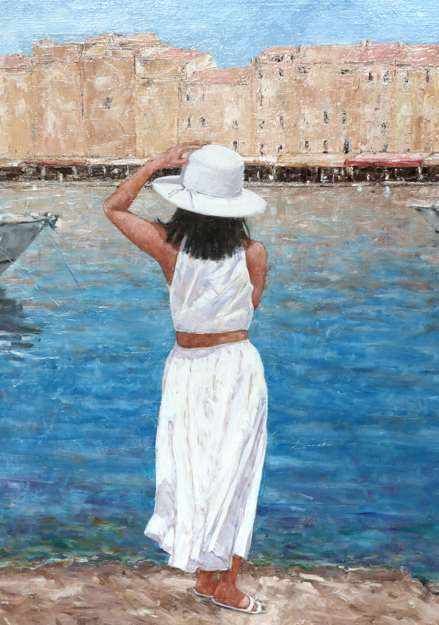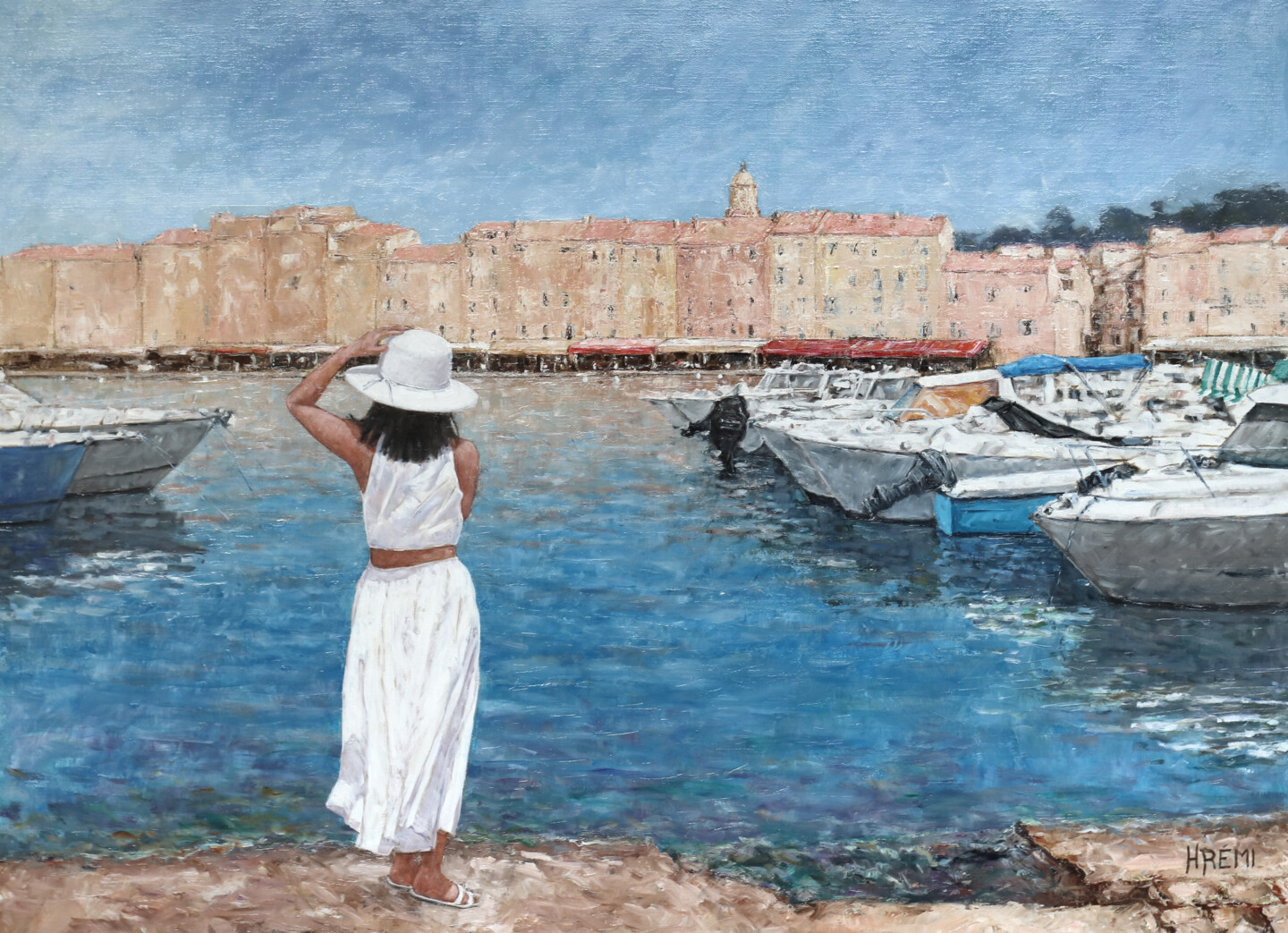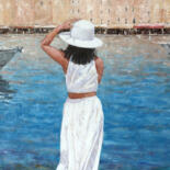 Une jeune femme bien habillée, admire le port de st Tropez tout en retenant son chapeau, qu'un coup de vent risque d'emporter..